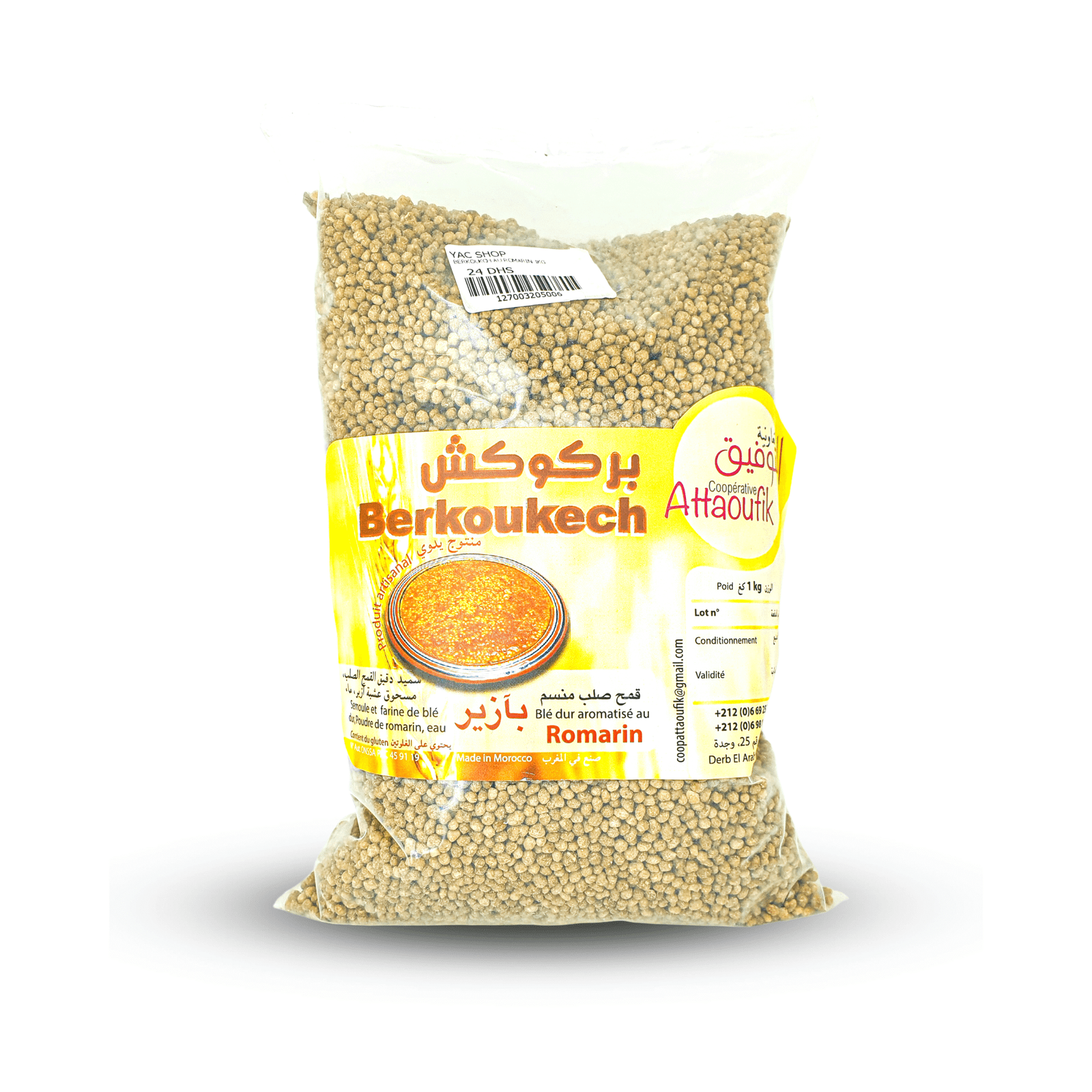 بركوكش الخاص بنا هو نوع من القمح القاسي عالي الجودة، بنكهة إكليل الجبل للحصول على نكهة فريدة وأصيلة. إكليل الجبل هو عشبة عطرية تقليدية في المطبخ المغربي، معروفة بخصائصها الطبية وطعمها اللذيذ. يعتبر بركوكش الخاص بنا مثاليًا لأولئك الذين يتطلعون إلى إضافة لمسة من الأصالة والنكهة إلى أطباق القمح القاسي الخاصة بهم.