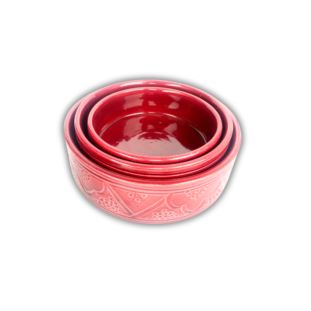 Découvrez l’élégance authentique de la poterie marocaine avec cet ensemble de 3 bols rouges, entièrement façonnés et décorés à la main par les artisans de Safi. Leur brillance, leurs motifs gravés et la qualité de la céramique en font des pièces uniques qui embelliront votre table ou votre intérieur.